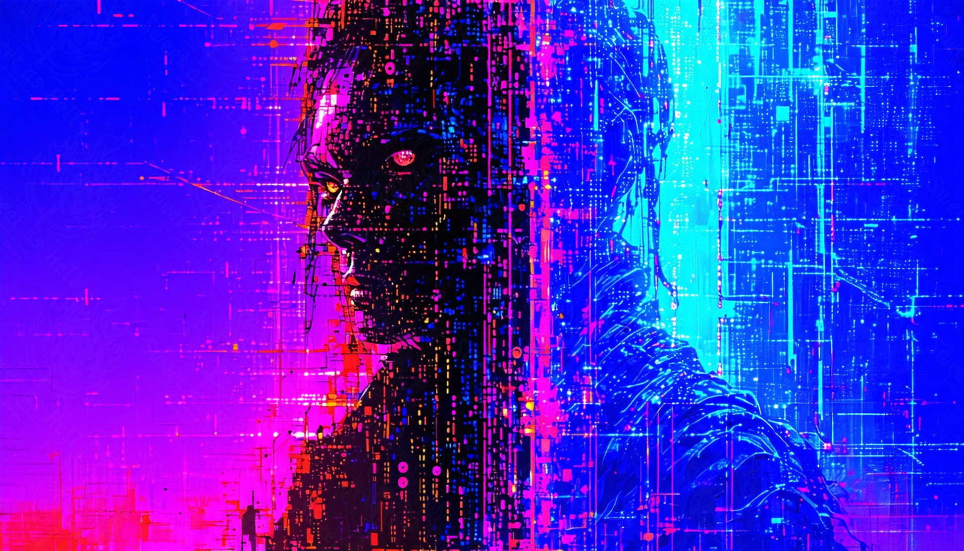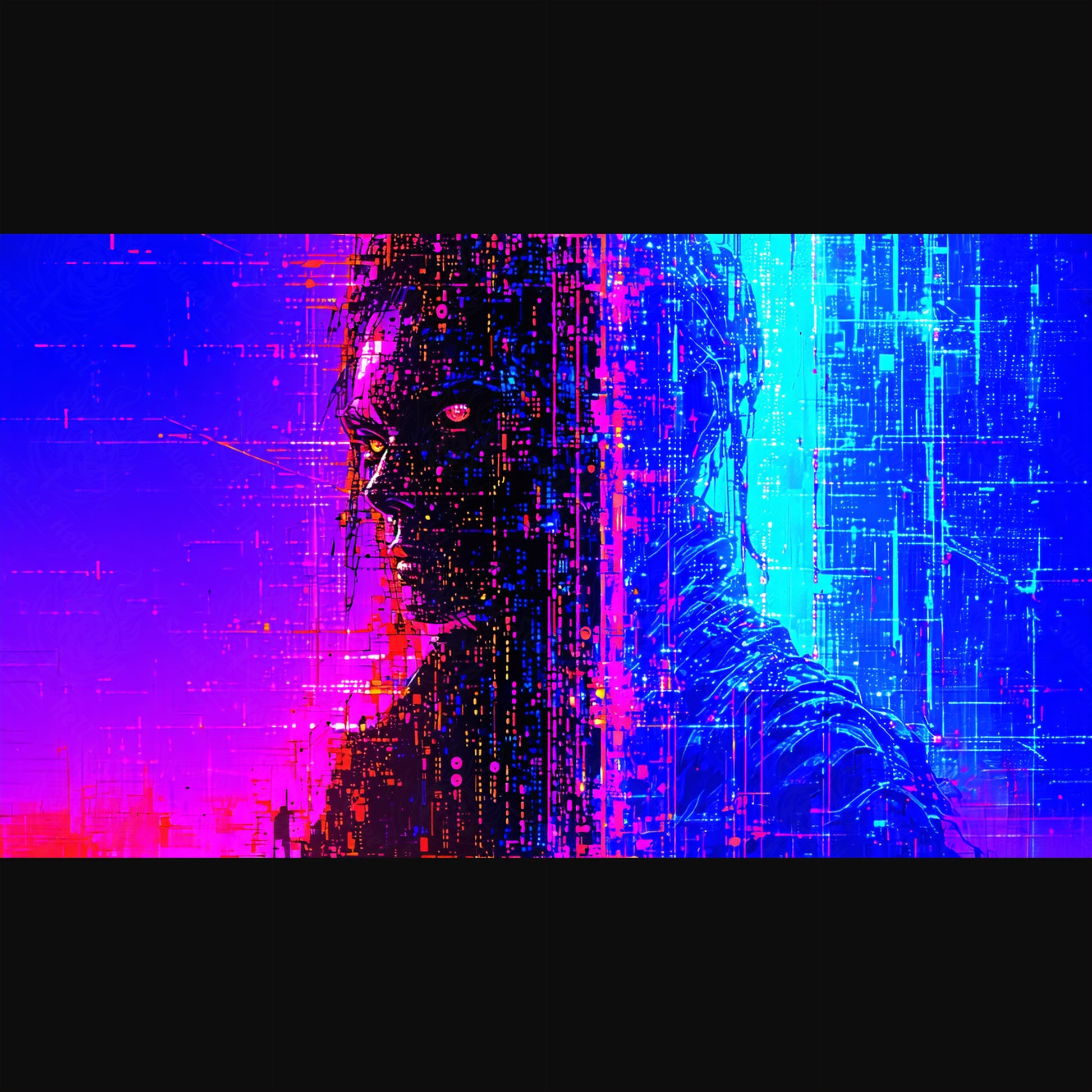 Una imagen impactante del perfil de una persona, que parece fusionarse con un paisaje digital. La obra de arte está llena de vibrantes tonos de rosa, violeta y azul, que crean un fuerte contraste. Los efectos de fallas y las líneas fragmentadas son prominentes, lo que le da a la imagen una sensación distorsionada y futurista. Los rasgos de la persona están parcialmente oscurecidos por los artefactos digitales, lo que agrega una sensación de misterio. El estilo recuerda a la estética ciberpunk, que combina elementos humanos con tecnología.