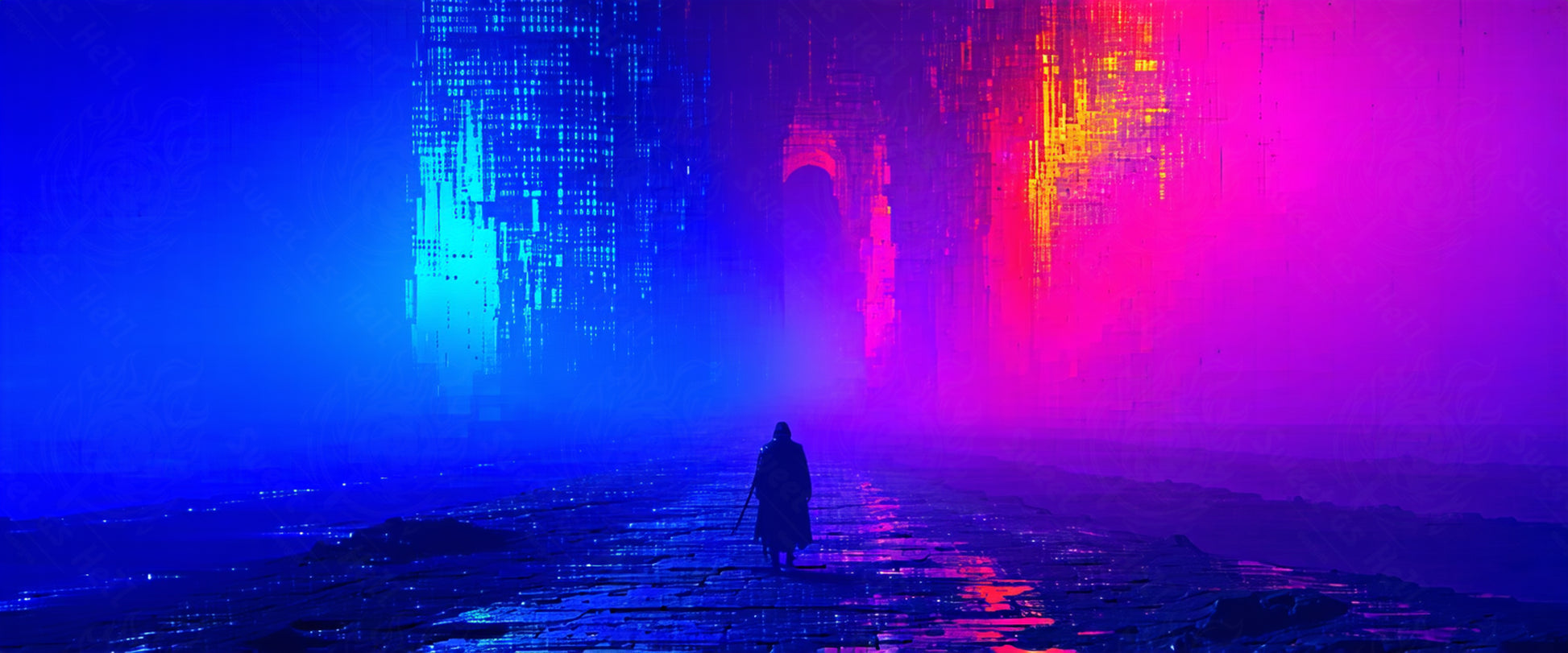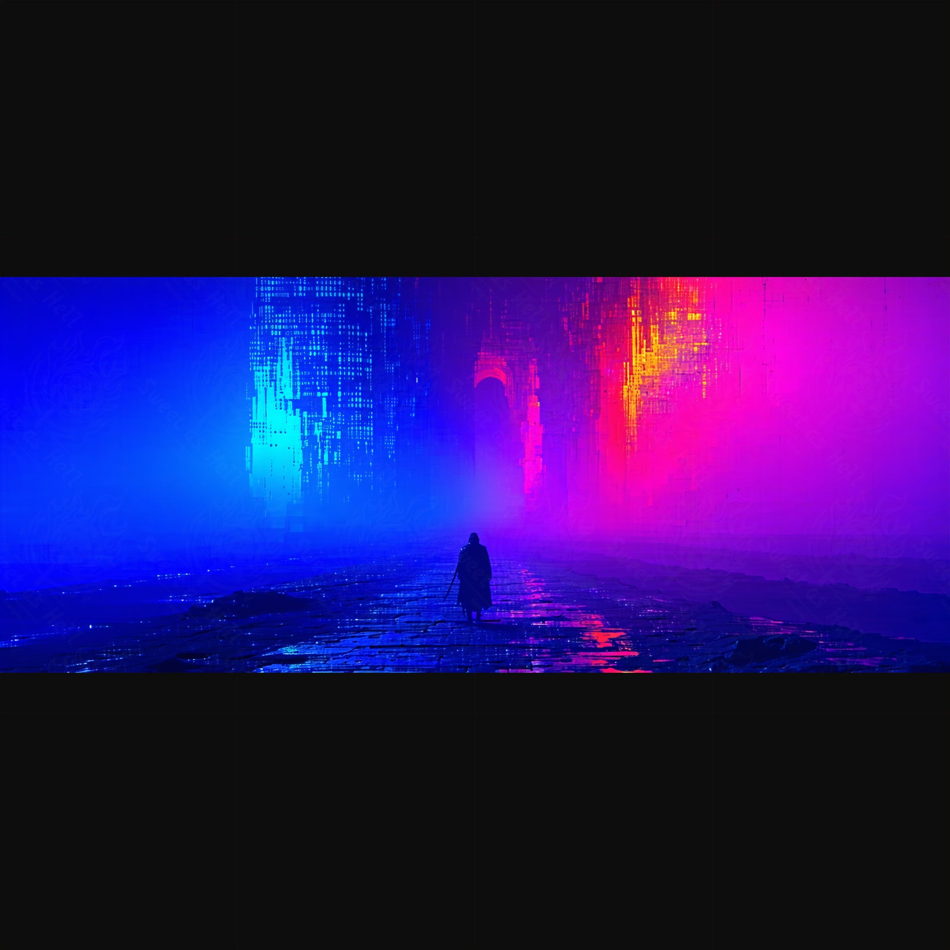 Una figura solitaria camina hacia una gigantesca puerta ciberpunk, bañada por una vibrante luz de neón azul y rosa. El camino que hay delante es una superficie rota y reflectante que insinúa un viaje a un mundo futurista.