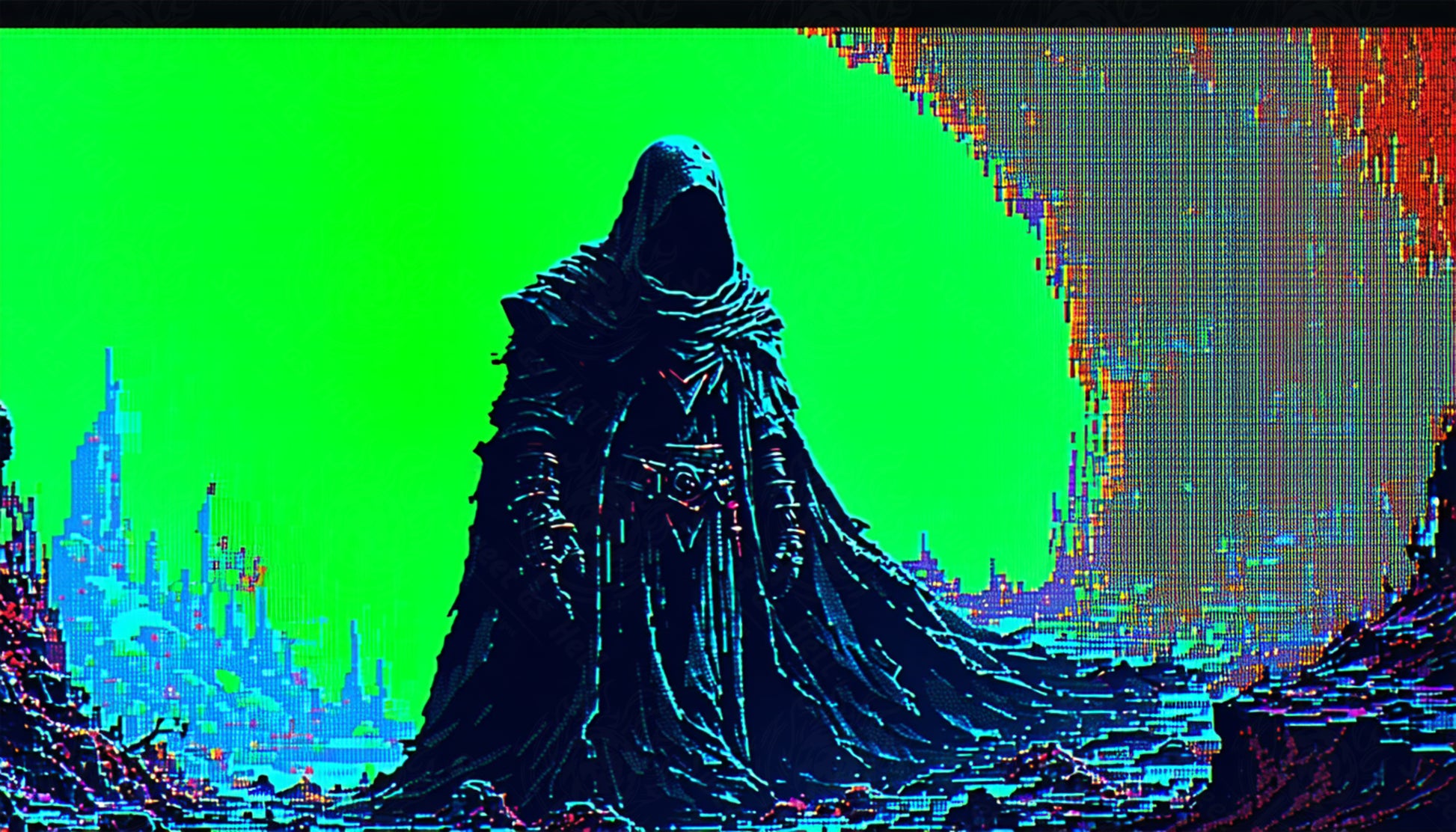 Una imagen pixelada de una figura que se parece a la Parca, vestida de negro y de pie sobre un fondo verde vibrante. El fondo parece tener fallas o distorsiones digitales, con patrones pixelados y aberraciones de color, particularmente notorias alrededor de un paisaje urbano en ruinas en la parte inferior de la imagen. La capa de la figura fluye hacia el suelo, también presenta pixelación y algunas variaciones de color, probablemente debido al efecto digital aplicado. La impresión general es la de una presencia oscura y de otro mundo en medio de un paisaje digital corrupto.